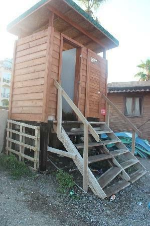In Çalış A, zoning posts were only used in limited parts at the beginning and end of the section, and nests were seen behind them (Fig.2a, Fig.11a c). The sunbeds were placed in a single row on mid beach (Fig.2a, Fig.12a b). Sundia Liberty and Güneş Hotel were the only two facilities keeping two rows of sunbeds on the beach (Fig.13a d). At night, most sunbeds were stacked and moved towards the wall (Fig.3b, Fig.14). Umbrellas in the entire section were fixed in the sand. Next to all the stairs leading to the beach, black hoses were seen extending (Fig13a). Although their purpose is unclear, they may be draining onto the nesting beach. Shower cabins placed near the stairs also drain directly onto the beach, with their undersides used as bins (Fig.13a, Fig.15).