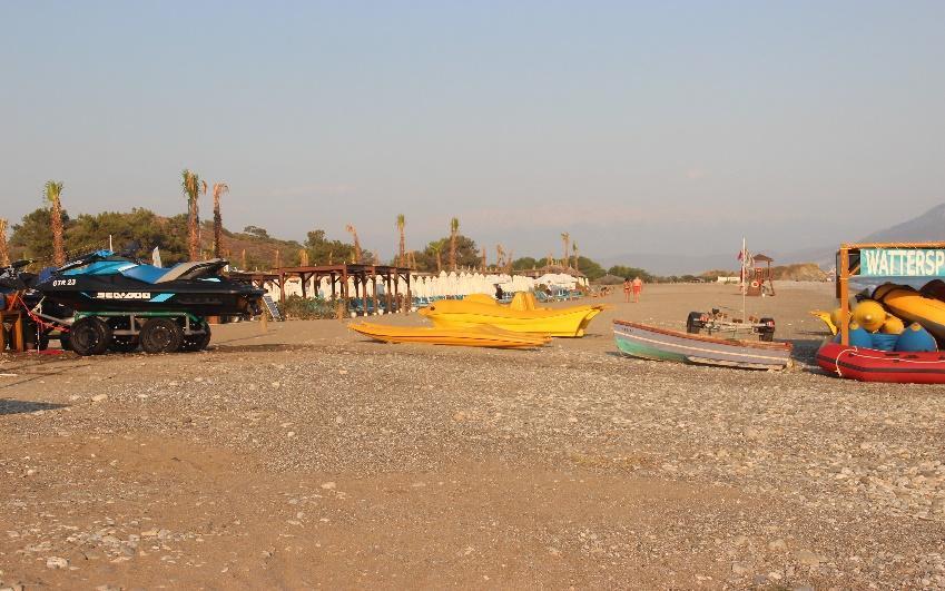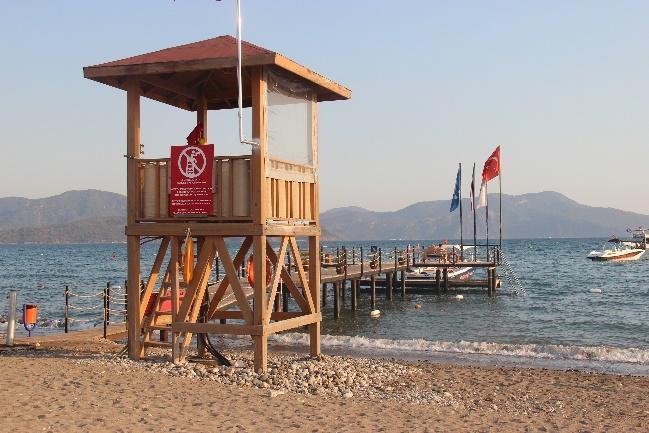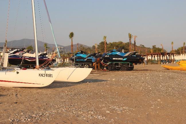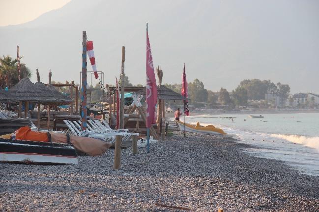 In Yanıklar, Karataş Beach is fully occupied with four rows of sunbeds, with vertical walkways in between, leaving virtually no space for sea turtle nesting (Fig.26a b). Sunbeds of Deniz İncisi (max 30) were placed in a single row behind the zoning posts, with fixed umbrellas in the sand (Fig.27a b). However, some people had inserted their personal umbrellas randomly into the sand within the nesting zone (Fig.27a, Fig.28). Liberty Fabay had about 20 pavilions, all behind the zoning posts located at least 30 metres away from the waterline, and the only structure within the nesting zone was a lifeguard tower (Fig.29a c). Between the two hotels, a water sports area keeps a very high number of sea vehicles including kayaks and speed boats on the nesting beach (Fig.30a c). There is also a ramp and a quay right next to it (Fig.31a b). Right next to the quay, Hotel TUI BLUE Sensatori Barut’s lifeguard tower stands very close to the sea (Fig.32a b). Apart from this area, not a single beach equipment was seen on the beach strip in front of the zoning posts. Vertical wooden walkways of Hotel TUI BLUE Sensatori Barut were far enough from the sea, with about 300 sunbeds and