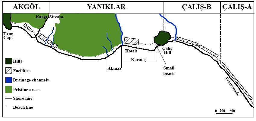 In Çalış B, acacia trees near Mavi Beach (Fig.17a, Fig.20a), Lotus Beach (Fig.18b c), and Leon Beach (Fig.22a d)remain.YücelBeachplantedbananatreesonthebeach(Fig.19b).ApacheBeachhasacacia,agave, and palm trees on the beach (Fig.24).