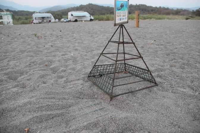 In the pristine section of Yanıklar, half of the nests checked by hand were protected with flat grills buried in the sand (Fig.77). Nests in all other sections were protected with prism cages bearing sea turtle signs and the nest number (Fig.2a, Fig.11b, Fig.18a, Fig.22c d, Fig.31a, Fig.32b, Fig.33, Fig.39, Fig.41a b, Fig.46, Fig64b d, Fig.78a b). Cages in the Akgöl hotspot had additional protective grills against predation at their base parts (Fig.47, Fig.78b).