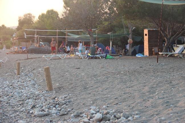 Akmaz beach is still used as a picnic area, although controlled by the newly established facility there. No campers were seen outside facilities or designated areas, except for one tent being set up behind the posts near Deniz İncisi and another one very close to the sea at the southern end of Çalış A (Fig.67a b). The operation of beach bars and other facilities seemed to continue until at least 00.00. Clear fire building remains were seen in the pristine section of Yanıklar (Fig.68a d).