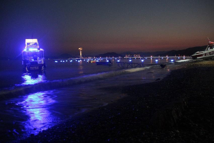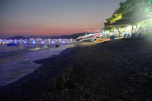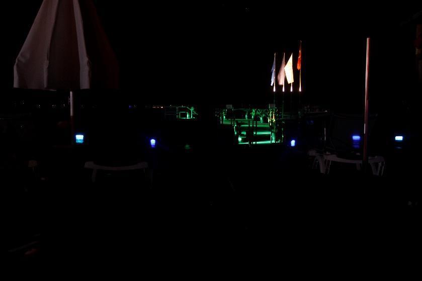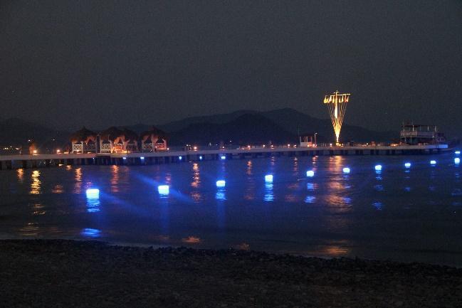 Fig.54. Fethiye SPA, Yanıklar. The quay between two big hotels illuminated with green and purplish blue lights, dimmer than last year.