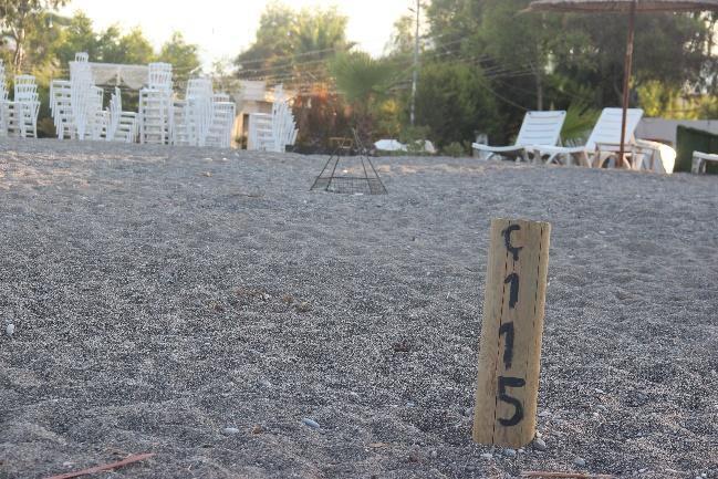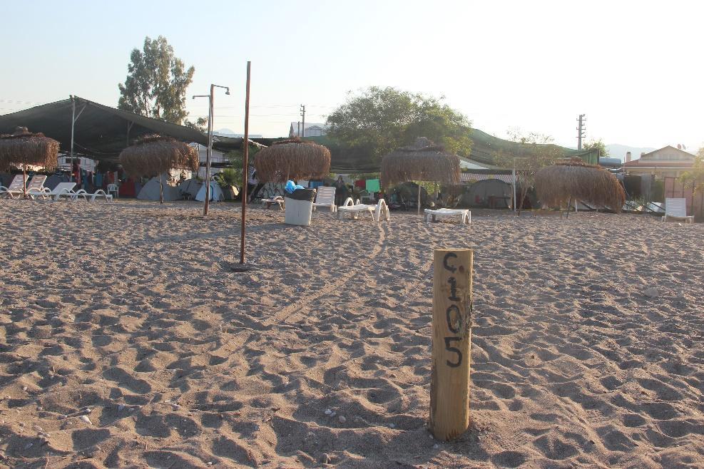 Environment and Urbanization in 5 SPA’s3, the Fethiye SPA was fitted with new wooden posts marking the nesting zone border, with the exception of the promenade area in Çalış A and the pristine section in Yanıklar Beach. However, the actual nesting zone in some areas visibly extends beyond the posts and nests were seen behind them. The most striking examples of incorrect zoning were in front of the Municipality’s facility in Akgöl, Okaliptus and Katrancı Beach in Yanıklar, Onur and Lotus Beach in Çalış B. Wooden posts in some parts of Çalış B, in particular, are only a few metres away from the sea, purposely leaving sandy areas suitable for nesting to be used for placing beach equipment.