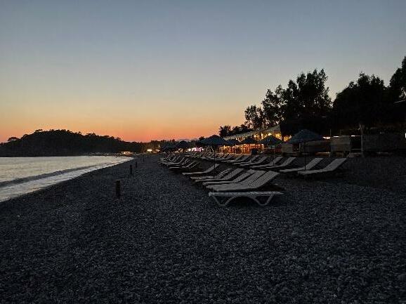 In Yanıklar, green and blue lights were seen in Karataş Beach and the dim lights of Deniz İncisi did not reach the nesting zone at night (Fig.52a b). Liberty Fabay, despite illuminating its pavilions with dim orange lights at night, created extreme noise pollution with its beach bar and disco, whichalso affect the nesting beach withlightshows(Fig.53a d).Thequaybetweentwohotelswas illuminatedwithgreenandpurplish bluelights, dimmer than last year (Fig.53a, Fig.54). Hotel TUI BLUE Sensatori Barut was calmer at night, with considerably less lights and usage of dim illumination of its beach bar (Fig.55a b). However, security lights between the two hotels extended beyond water sports area and the sunbeds, even the wooden posts, reaching the shore (Fig.55a).