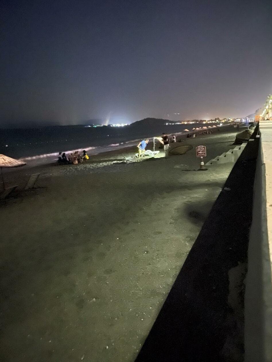In the promenade area in Çalış A, orange pinkish lights embedded along the wall are not visible from the beach, but the tall lamp posts with bright lights are, although they are not facing the beach (Fig.2a b, Fig.3a b). Cafés and bars at this area are now pushed back a bit, leaving more distance between them and the beach, further reducing the light pollution affecting the nesting zone. Three people were observed erecting a new umbrella on the nesting beach at night, in front of Sundia Hotel in Çalış A (Fig.48).