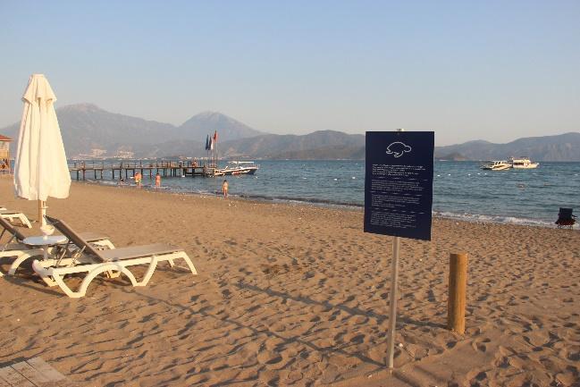 The number of signs in the entire SPA were higher in summer 2022, with the majority of signs renewed to bear the Ministry’s new name (Fig.11b, Fig.12b, Fig.16b, Fig.73a b), except for the two old Ministry signs near the caravan park area in Kızılot (Fig.10a, Fig.43a 43d, Fig.74a) and one at the southern end of Çalış A (Fig.74b).AnewsignwasplacedinfrontofDenizİncisi(Fig.27a,Fig.67a).GPSdataofall importantMinistry sign locations in the region are given in Table 1. Apart from these, beach usage rules were placed in a number of locations in Çalış (Fig.13d, Fig.19b, Fig.74b). A sign in front of Hanel Houses prohibited moving sunbeds beyond the zoning posts (Fig.75), TUIBLUE Sensatori Barut placed its own signs on all beach entrance points (Fig.31b, Fig.64c), and the final sign was near the hotel’s last pavilion towards Akmaz Beach, where the last zoning post also stood.
