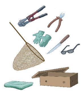 καθώς μπορεί το κοφτερό σημείο να τραυματίσει περαιτέρω το πτηνό. Εάν μπορείτε να το δείτε, ισιώστε πρώτα το κοφτερό σημείο με την πένσα. Επειδή η αφαίρεση του αγκιστριού μπορεί να τραυματίσει περαιτέρω το πτηνό ή το αγκίστρι έχει καταποθεί, κόψτε την πετονιά όσο το δυνατόν πιο κοντά στο ράμφος και αφήστε το αγκίστρι στο πτηνό. Ακολουθήστε τις οδηγίες που παρέχονται στο Τεχνικό Φύλλο 3. Κρατήστε το πτηνό γερά ανάμεσα στα π ό δ ι α σ α ς χω ρ ί ς ν α τ ο π ι έ ζ ε τ ε . Κ ρ α τ ή σ τ ε τ α φ τ ε ρ ά τ ο υ π ά ν ω σ τ ο σώμα του για να αποφύγετε τυχόν κίνδυνο εξάρθρωσης ή κατάγματος. 4 5