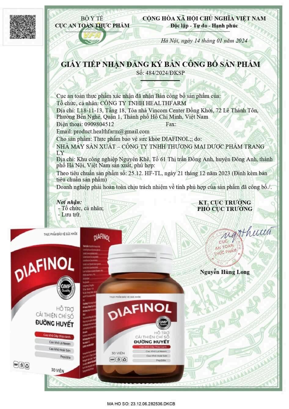 Ngay cả khi đang viết bài này (21/1/2025), chúng tôi kiểm tra Diafinol vẫn được Bộ Y tế tín nhiệm, chứng nhận kỹ càng, và còn lưu trực tiếp trên cả hệ thống của Cục ATTP - Bộ Y tế Nên chúng ta có thể yên tâm.