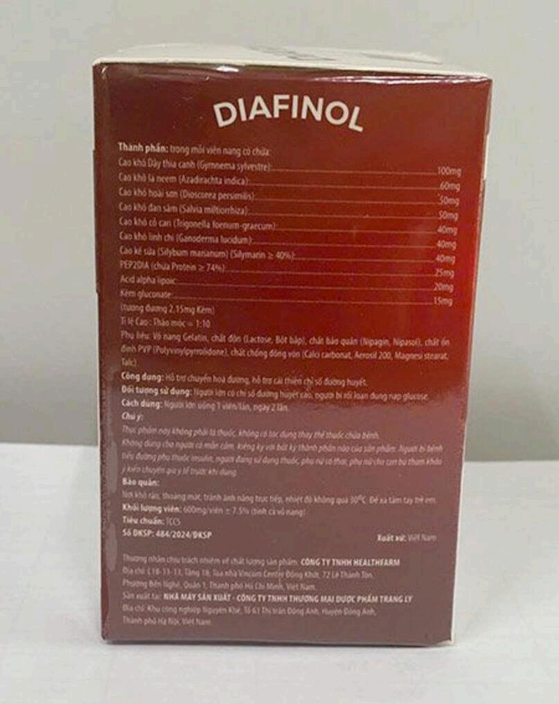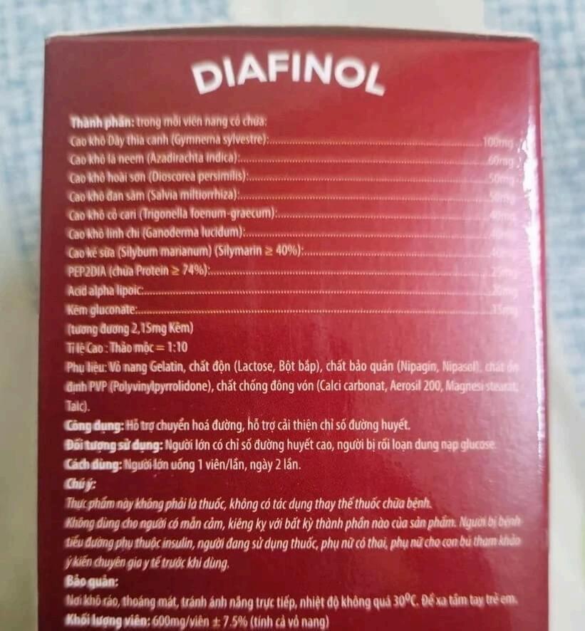 Ngay cả thông tin về thành phần, công dụng in trên hộp Diafinol, cũng đã được