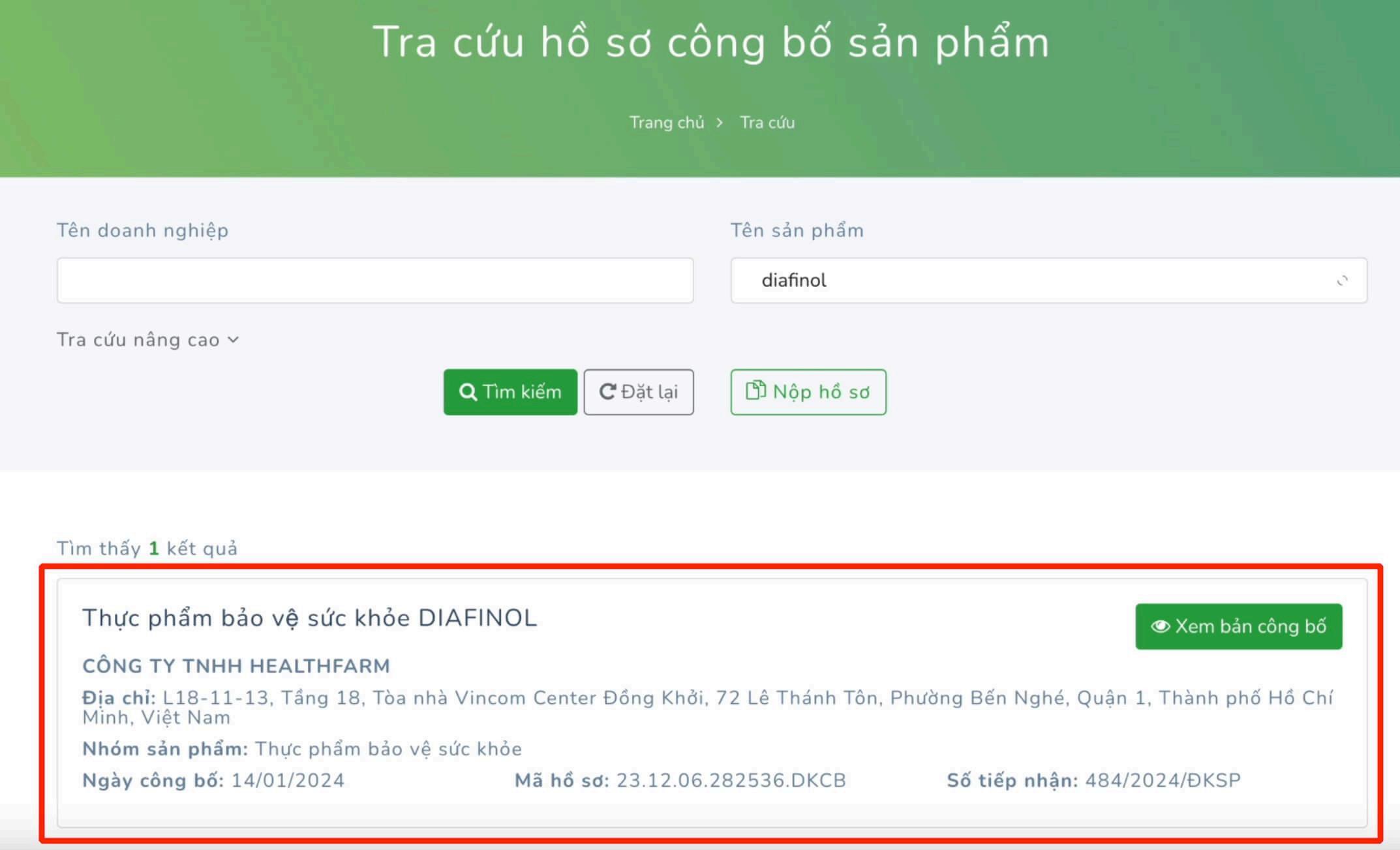 Sau đó sẽ xuất hiện ngay Thông Tin Công Bố Sản Phẩm DIAFINOL.
