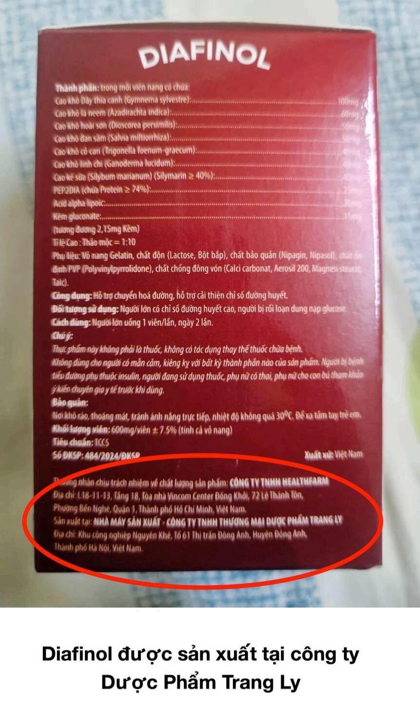 Hiện tại, thuốc tiểu đường Diafinol còn được sản xuất tại công ty TNHH Thương Mại dược phẩm Trang Ly uy tín, ra đời từ 2001, “đạt top 100 nhà máy dược phẩm hàng đầu Việt Nam”.