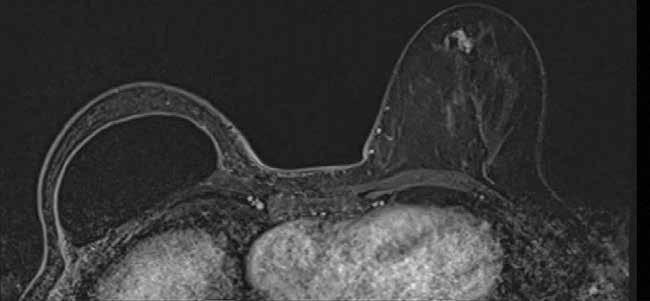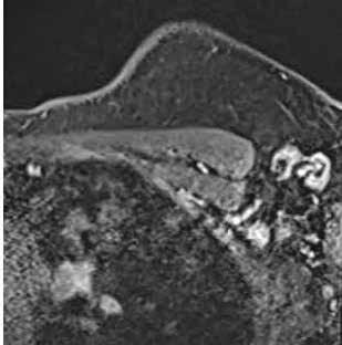 El día 1 de julio de 2021, la paciente acudió a su centro de referencia para RMN de seguimiento. El reporte correspondiente indicó que la lesión no presentaba modificaciones relevantes respecto de su tamaño, pero sí cambios en el patrón de captación del contraste, con realce heterogéneo, fundamentalmente periférico con áreas centrales hipocaptantes, probable mente secundarios al tratamiento. Adicionalmente, se informó de algunos focos de hiperintensidad de señal en la sustancia blanca en región frontal y parietal derechas que se interpretaron como sugestivos de pequeños focos de desmielinización “secundarios al tratamiento” (Figura 3).