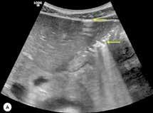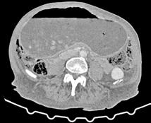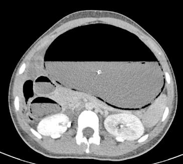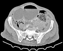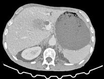 Se decide volver a ingresar al paciente en planta de Medicina Interna para realizar tratamiento con Casponfungina endovenosa y nuevo TAC ab dominal de control. Se nos avisa directamente desde el Servicio de Radio diagnóstico por la llamativa dilatación gástrica visible en el TAC (Figura 2), siendo estas imágenes difícilmente compatibles con el buen estado gene ral, buena tolerancia oral y mantenimiento de deposiciones que muestra el paciente.
