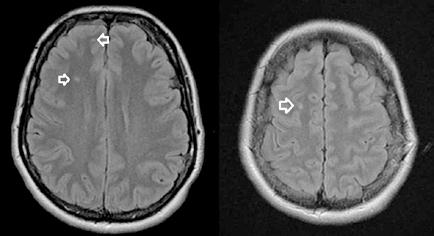 Señalados con flechas, focos de hiperintensidad de señal en la sustancia blanca en región frontal y parietal derechas, sugestivos de pequeñas zonas de desmielinización distantes a la zona irradiada.