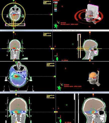 Figura 2. Mitad superior: planificación de tratamiento de radioterapia mediante arcoterapia volumétrica de intensidad moderada (VMAT) de dos arcos coplanares. Mitad inferior: Distribución de dosis: solo el volumen circunscrito en color rojo corresponde a aquel en el que se administra la totalidad de la dosis prescrita; el volumen sombreado en azul solo llegaría a recibir, como máximo, un 10% de la dosis prescrita, y el sombreado en verde apenas llegaría al 50%.