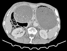 Durante el ingreso, mientras se optimiza el estado del paciente con transfusiones de concentrados de hematíes y hierro endovenoso, se le rea liza una tomografía computerizada abdomino-pélvica para descartar pa tología orgánica intrabdominal como posible causante de dicha anemia, y en él se evidencia un estómago llamativamente distendido, con contenido alimenticio ocupando la cavidad abdominal, desplazando asas intestinales e incluso el hilio hepático con una ligera dilatación de la vía biliar intrahe pática; además se visualizan dos adenopatías retroperitoneales. Debido a la gran dilatación gástrica, no se ve con exactitud la unión gastroduodenal ni la anatomía adyacente. Por no poder descartar patología a este nivel que pudiera causar sangrado anemizante y como estudio para buscar causa de dicho estómago retentivo, se solicita una gastroscopia.