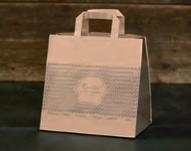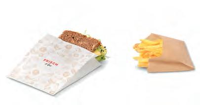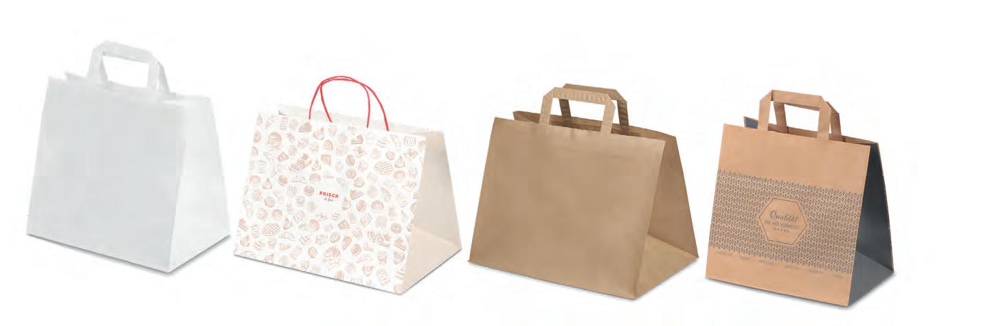 ■ Griff 5-fach gefaltet aus Kraftpapier (weiß/braun unbedruckt und Motiv «Genuss») oder gedrehter Papierkordel (Motiv «FRISCH & fein») – für angenehmes Tragen