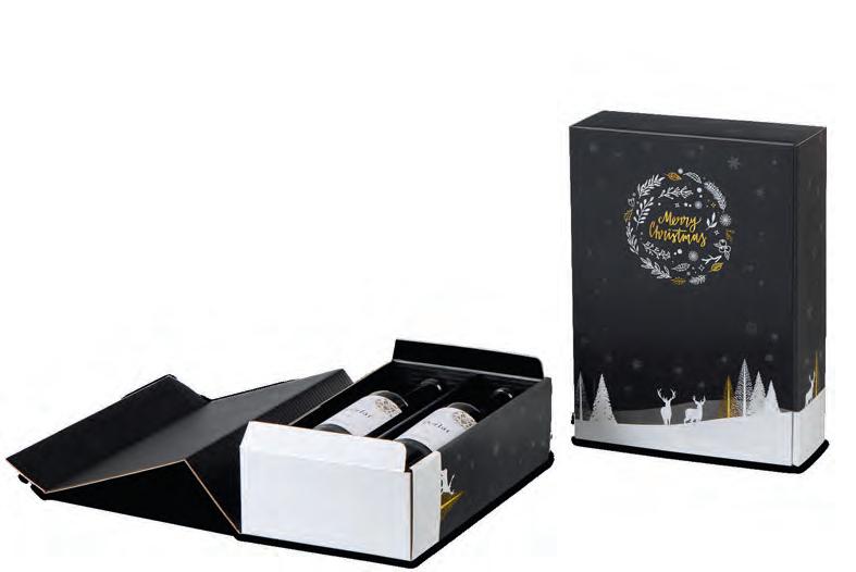 Weihnachtliche Geschenkbox mit «Merry Christmas» Schriftzug für Weinflaschen oder Präsente. Die mit feinen Eiskristallen verzierte Schachtel erhält duch den hochwertigen, dreidimensional wirkenden Aufdruck von Tannenzweigen, Christbaumkugeln, Rentier und Co. einen besonders edlen Charakter. elegante Oberfläche bedruckt mit feinen Eiskristallen sowie Weihnachtsmotiven in hochwertiger 3D-Optik sehr guter Schutz der Flaschen durch die variable, schwarze Wellkartoneinlage auch ohne Einlage als Geschenkschachtel nutzbar spart Lagerplatz – wird flach angeliefert einfach und schnell aufgerichtet aus Wellkarton, recyclingfähig