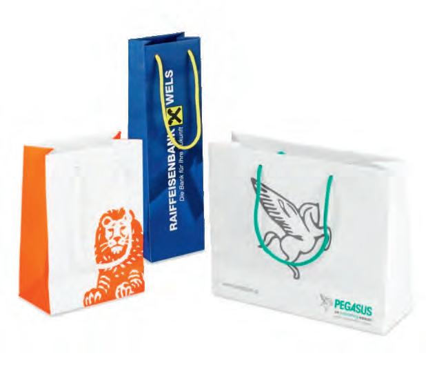 hochwertiges Papier (200 g/m2) mit Matt- oder Glanzfolie und PP-Kordel schon ab 500 St. – 12 Grössen zur Wahl Bedruckung 1 bis 4-farbig möglich
