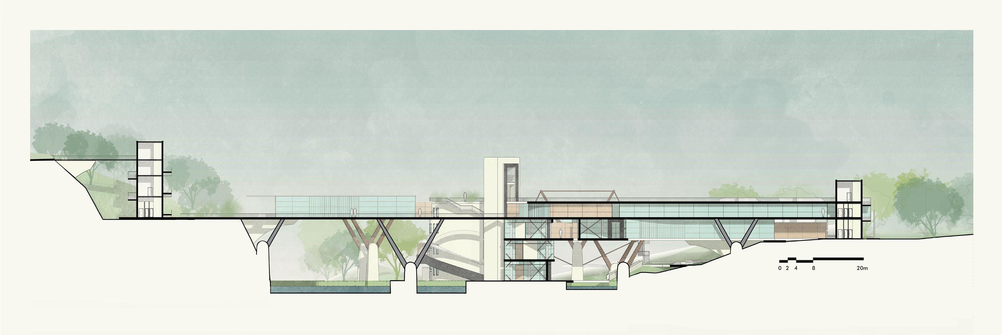 The research centre is designed as a ‘bridge-building’ on a marginal piece of land lying amidst river Lowther. Half of the building’s spaces are suspended and the river flows underneath them. This arrangement follows the idea of ‘touching the earth lightly’ which is a thought also evident in the spirit of Permaculture. The narrow floor plates combined with glazed facades allow the spaces to be naturally lit throughout the day.