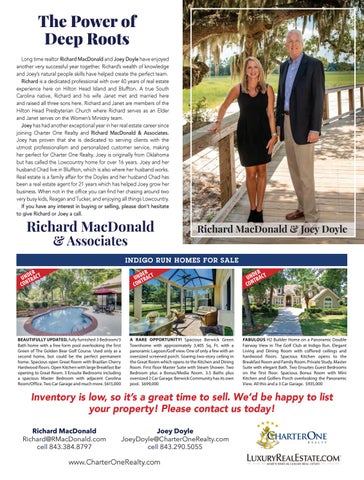 Long time realtor Richard MacDonald and Joey Doyle have enjoyed another very successful year together. Richard’s wealth of knowledge and Joey’s natural people skills have helped create the perfect team. Long time realtor Richard MacDonald Richard is a dedicated professional with over 40 years of real estate and Joey Doyle have enjoyed another very Bluffton. A true South experience here on Hilton Head Island and successful year together. Richard’s wealth Carolina native, Richard and his wife Janet met and married here of knowledge and Joey’s and raised all three sons here.natural Richardpeople and Janet are members of the skills have helped create the perfect Hilton Head Presbyterian Church whereteam. Richard serves as an Elder Long time realtor Richard MacDonald Richard is a dedicated professional and Janet on theenjoyed Women’s Ministrywith team. and Joeyserves Doyle have another very over 40 of real estate experience hasyears had another exceptional yearwealth in her real estate career since Joey successful year together. Richard’s here on HiltonOne Head Island and Bluffton. joining Charter Realty and Richard MacDonald & Associates. of knowledge and Joey’s natural people A true South Carolina native, Richard Joey proven that she the is dedicated to serving clients with the skills has have helped create perfect team. and hisprofessionalism wife met and married here utmost and personalized customer service, making Richard is aJanet dedicated professional with and raised all three sons here. Richard her perfect for Charter One Realty.experience Joey is originally from Oklahoma over 40 years of real estate and are members theBluffton. but hasJanet called theHead Lowcountry home forHilton over 16 years. Joey and her here on Hilton Islandof and Head Presbyterian Church where Richard husband liveCarolina in Bluffton,native, which isRichard also where her husband works. A true Chad South serves an Janet serves onhere the her husband Chad has Real is aElder familyand affair for the Doyles and andestate hisaswife Janet met and married Women’s Ministry team. been real estate agent for 21 here. years which has helped Joey grow her and araised all three sons Richard Joey has had another year business. When in the exceptional office findinher chasing around two and Janet arenot members ofyou thecan Hilton her real estate career since joining very busy kids, Reagan and Tucker, andCharter enjoying all things Lowcountry. Head Presbyterian Church where Richard One Realty and Richard MacDonald & please don’t hesitate serves If youas have interest in buying oron selling, an any Elder and Janet serves the Associates. Joey has proven that she to give Richard or Joey a call. Women’s Ministry team. is Joey dedicated servingexceptional clients with has hadtoanother yearthe in utmost professionalism and personalized her real estate career since joining Charter customer service, making her perfect for One Realty and Richard MacDonald & Charter One Realty. Joey is originally Associates. Joey has proven that from she Oklahoma buttohas called clients the Lowcountry is dedicated serving with the home for over 16 years. and her utmost professionalism andJoey personalized INDIGO RUN HOMES FOR SALE husband Chad live in Bluffton, which customer service, making her perfect for is also her Joey husband works. from Real ER ER ER where Charter One Realty. is originally UNDTRAC T UNDTRAC T AC Ta family affair for the Doyle’s and UNDTRis estate Oklahoma but has called the Lowcountry CO N CO N CONhusband Chad has been a real estate her home for over 16 years. Joey and her agent for 21 yearslive which helpedwhich Joey husband Chad in has Bluffton, grow her business. When not in the offi ce is also where her husband works. Real you can fi nd her chasing around two very estate is a family affair for the Doyle’s and busy kids, Reagan enjoying her husband Chadand hasTucker beenand a real estate all things Lowcountry. agent for 21 years which has helped Joey If you any When interest or grow her have business. notininbuying the office selling, please don’t hesitate to give BEAUTIFULLY fully furnished Bedroom/3 A RARE OPPORTUNITY! Spacious Berwick Green FABULOUS H2 Builder Home on a Panoramic Double you can findUPDATED, her chasing around 3two very Bath with a free form pool overlooking the first Townhome with approximately 3,405 Sq. Ft. with a Fairway View in The Golf Club at Indigo Run. Elegant Richard or Joey a and call. busyhome kids, Reagan Tucker and enjoying
