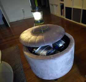 I vardagsrummet döljer en puff ett överlevnadskit med bland annat triangakök och vevljus.