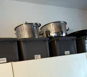 Om man lyfter blicken till ovanför köksskåpen ser man också välorganiserade och prydligt etiketterade plastlådor med saker som kan behövas och ett hörn finns ett gasolkök i miniformat dolt i en plastväska.