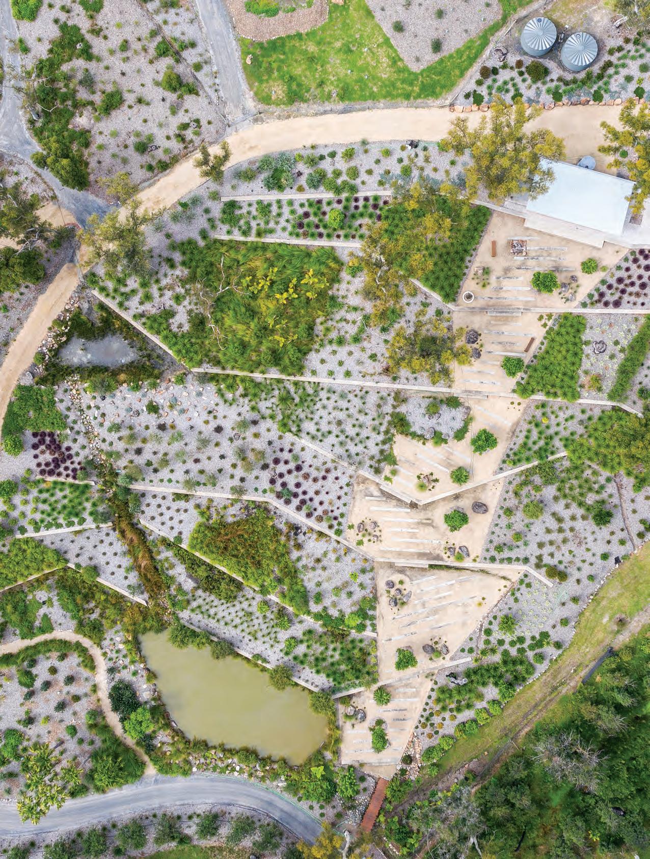 Not wanting to do things by halves, Turner, with assistance from friends, brought in 25,000 plants and trees. Cultivars including grevilleas and ground covers were placed in both upright and prostrate positions for verdant ground cover.