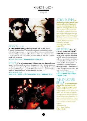 Pour Kap Bambino, un duo très sexy de Bordeaux, les concerts se vivent à 200 à l’heure. Inutile de chercher à suivre le tempo. Avec un sens inouï de la déstructuration et des effets de saturation, Orion et Khima France L’un de leurs morceaux l’affirme pour eux : ils sont là pour auront vite fait de vous perdre. Les rester ! Les Dijonnais de Jaromil ont des arguments à faire valoir pour s’inscrire accents metal de leur production sur la durée : une pop indie électrique très inspirée. Avec l’idée que la vie se situe electro conduisent à une expérience ailleurs, ils n’hésitent pas à dévorer les kilomètres pour aller à la rencontre d’un sensorielle pure, dont on ne sort pas forcément indemne. public qui leur rend bien leur étonnante ferveur sur scène. c France - Post-Punk / Métal c France - Indie / Pop Besançon 19/02 + Dijon 20/02 Dijon 14/02 + Belfort 17/02 + Montbéliard 18/02 + Mulhouse 19/02 + Belfort 21/02