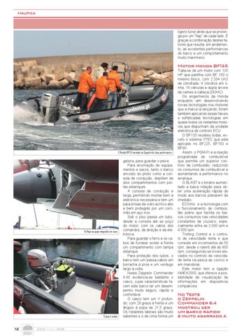 Motor Honda BF135 Trata-se de um motor com 135 HP que partilha com BF 150 o mesmo bloco, com 2.354 cm3 de cilindrada, 4 cilindros em linha, 16 válvulas e dupla árvore de cames à cabeça (DOHC). Os engenheiros da Honda enquanto iam desenvolvendo novas tecnologias nos motores que a marca ia lançando, foram também aplicando essas fiáveis e sofisticadas tecnologias em quase todos os restantes motores que dispunham da unidade eletrónica de controlo ECU. O BF135 recebeu todas, exceto o sistema VTEC que está aplicado no BF225, BF150 e BF90. Assim, o PGM-FI é a injeção programada de combustível que permite um superior controlo da combustão, reduzindo os consumos de combustível e aumentando a performance no arranque. O BLAST é o binário aumentado a baixa rotação para obter uma aceleração rápida de modo aos barcos planarem de imediato. ECOmo é a tecnologia com o funcionamento de combustão pobre que facilita os baixos consumos nas velocidades constantes de cruzeiro, especialmente entre as 3.000 rpm e 4.500 rpm. Trolling Control é o controlo de velocidade lenta e que consiste em incrementos de 50 rpm, desde o ralenti até às 900 rpm, conseguindo-se níveis elevados no controlo de velocidade lenta na pesca ao corrico e em manobras. Este motor tem a ligação NMEA2000, que oferece a possibilidade de visualização de informações em dispositivos compatíveis No Teste o Zeppelin Commander 6.4 mostrou ser um barco rápido e muito agarrado à
