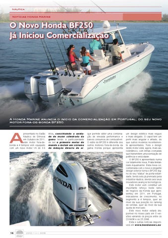 um design estético mais esguio e mais delgado. O capot tem um perfil mais angular e afilado, do que outros modelos recentemente apresentados. Todo o design deste motor está, agora, mais aerodinâmico, com linhas cromadas que transmitem uma sensação de potência e velocidade. O BF250 é apresentado numa cor totalmente nova, Prata Metalizado Aquamarine. Esta nova cor, combinada com o novo e elegante design exterior torna o BF250 digno do seu “status” de porta-estandarte, tendo sido já premiado pela indústria náutica, devido aos seus inovadores avanços tecnológicos. Este motor vem constituir um importante reforço neste ramo de negócio da Honda que apresentou em 2011, em Portugal, indicadores de crescimento, no segmento a 4 tempos, quer ao nível da sua posição no ranking de vendas, quer ao nível da sua quota de mercado. Este novo motor estará disponível no nosso país em 5 versões variando os preços entre os 23.843€ e os 25.206€. Esta e outras notícias disponíveis em www.hondanews.eu