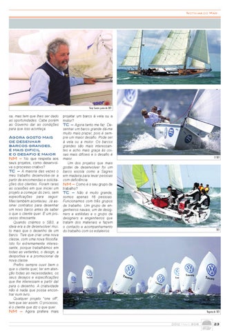 sa, mas tem que lhes ser dado as oportunidades. Cabe porém ao Governo dar as condições para que isso aconteça. Agora gosto mais de desenhar barcos grandes, é mais dificil e o desafio é maior NM – No que respeita aos seus projetos, como desenvolve o processo criativo? TC – A maioria das vezes o meu trabalho desenvolve-se a partir de encomendas e solicitações dos clientes. Foram raras as ocasiões em que iniciei um projeto a começar do zero, sem especificações para seguir. Mas também aconteceu. Já assinei contratos para desenhar um novo barco antes de saber o que o cliente quer. É um processo stressante. Quando criámos o SB3, a ideia era a de desenvolver muito mais que o desenho de um barco. Tive que criar uma nova classe, com uma nova filosofia. Isto foi extremamente interessante, porque trabalhámos em todas as vertentes, o design, a desportiva e a promocional da nova classe. Prefiro sempre ouvir bem o que o cliente quer, ter em atenção todas as necessidades, os seus desejos e especificações que lhe interessam e partir daí para o desenho. A criatividade não é nada que possa encontrar num livro. Qualquer projeto “one off”, tem que ser assim. O processo, é o cliente que diz o que quer. NM – Agora prefere mais