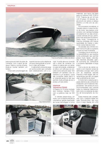 ckpit. A porta abre-se correndo sob o posto de comando. No interior a cabina tem um armário para arrumação, prateleiras à volta e um sofá que se converte numa cama de casal. Tem também um sanitário com wc marítimo e um lavatório. Outra das inovações deste barco é a comprida janela no teto que permite muita entrada de luz e produz um belo efeito. Motor Yamaha F300 O Espera 34 TA tinha montado dois motores Yamaha F300, com a potência total de 600 HP. A Yamaha desenvolveu um motor com a máxima eficiência volumétrica, graças à aplicação de novas tecnologias e novos