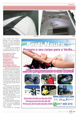 pode mostrar tudo, desde a pressão do óleo, temperatura da água, a carga da bateria, fluxo e níveis de combustível, e ainda temperatura da água e profundidade. Os motores têm igualmente o inovador sistema Y-COP, a proteção eletrónica anti roubo. No teste, o Rio Espera 34 TA mostrou que o casco, com um V profundo, oferece um desempenho confortável e também atinge boas performances. Estávamos à espera que no arranque levássemos mais tempo a planar, pois o Rio Espera 34 TA é um barco compacto e robusto com cerca de 5.000 Kg de peso. Também a forma do casco em V profundo que agarra o barco mais à água, não deveria facilitar a saída. Mas não foi isso que aconteceu, pois em 1,96 segundos já estávamos a planar. Isto deveu-se não apenas à forte aceleração dos dois Yamaha de 300 HP, mas também aos planos de estabilidade laterais mais salientes atrás e que facilitaram também a descolagem do casco da água. Na aceleração até às 5.000 rpm, o barco chegou em 14 segundos aos 34 nós. Quando acelerámos ao máximo, às 5.800 rpm, atingimos os 46,1 nós, que consideramos uma excelente performance para o conjunto. No mínimo de velocidade 2012 Maio 305