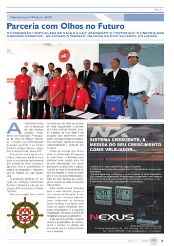 nacional que vai dotar as escolas de mais equipamento e permitir que mais crianças tenham acesso à prática da vela. Este é um desporto que desenvolve, entre outros, as capacidades de autonomia, interação, espírito de equipa, responsabilidade e proteção dos oceanos. Todas as escolas que fazem parte da Federação Portuguesa de Vela foram contactadas para participar deste projeto único. As escolas interessadas em aderir assinaram um protocolo e especificaram as suas necessidades no que diz respeito a velas. No total, são 47 as escolas protocoladas e mais de 400 crianças que começam a receber as velas no próximo mês de Maio. Este contrato é uma mais-valia para a vela nacional, porque é uma aposta na formação. A modalidade tem enormes talentos, como comprovam os inúmeros títulos mundiais e europeus, bem como as quatro medalhas olímpicas conquistadas (é a segunda modalidade com maior número de medalhas a seguir ao atletismo). Esta parceria permite a alguns clubes a possibilidade de aumentarem o número de atletas nas escolas de vela e a outros retomarem a atividade.