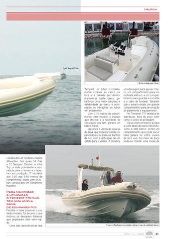 construídos 46 modelos Capelli diferentes, dos quais 14 Cap e 32 Tempest. Destes, a linha Top, a mais polivalente e concebida para o recreio e o lazer, tem em produção 17 modelos dos 3,60 aos 9,60 metros de comprimento, todos com os tubos construídos em Neoprene/ Hypalon. Para maximizar a utilização, o Tempest 770 Sun tem uma ampla gama de equipamentos Facilitar o mais possível o uso deste modelo, foi decerto o que motivou os designers italianos que projetaram este semi-rígido. Uma das características dos