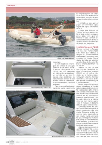 Motor Yamaha F250 O motor montado no Tempest 770 Sun, era o Yamaha F250. Este motor, que substituiu o antigo F250, que era bastante mais pesado, partilha do mesmo bloco do Yamaha F300 e dispõe de todas as restantes características deste motor. Debita no entanto 250 HP em vez de 300 HP. Trata-se de um V6 com com 60 graus, 24 válvulas, dupla árvore de cames à cabeça (DOHC) e 4.169 cm3 de cilindrada, que a Yamaha desenvolveu com a máxima eficiência volumétrica, em virtude de terem aplicado novas tecnologias e novos materiais. Devido a isso, utilizando processos inovadores, a Yamaha reduziu o peso do bloco do motor e este passou a ter cilindros com camisas fundidas em plasma, em vez das convencionais camisas em aço, conseguindo mais área para os pistons. Deste modo, obteve-se a máxima cilindrada com menos quantidade de massa e foi bastante reduzido o peso total do motor. Agora as paredes dos cilindros sofrem menos fricção e os pistons movem-se mais livremente. Obteve-se também um enorme rácio peso/potência, que resultou numa aceleração tal que permite planar muito rápido, atinge-se velocidades máximas elevadas, grande economia de combustível e excelente fiabilidade a longo prazo. Algumas das características que têm um papel vital na eficiência do motor, são a conjugação da árvore de cames variável com maiores canais de admissão e escape, bem como com