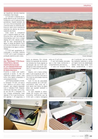 as respetivas válvulas maiores e também mais largas. O F250 tem o sistema de injeção eletrónica de combustível multiponto com 6 injetores independentes. Dispõe também de um novo microcomputador que controla todos os sistemas eletrónicos, bem como controla os sistemas de alarme de funcionamento do motor. Este motor é compatível com o sistema digital em rede, Drive-by-Wire, que dá todas as informações num novo e largo display em LCD, desde a pressão do óleo, temperatura da água, a carga da bateria, fluxo e níveis de combustível, e ainda temperatura da água e profundidade. O F250 tem igualmente incorporado o inovador sistema Y-COP, com o qual consegue a proteção eletrónica anti roubo. O teste do Tempest 770 Sun mostrou boas performances e um desempenho com comodidade e segurança. Fizemos o teste com quatro pessoas a bordo. O mar em Vilamoura estava calmo, mas tinha uma ligeira ondulação e uma pequena brisa. Já tínhamos testado o modelo Tempest 770 WA, um barco com cabina e um pouco mais pesado, que estava equipado com o Yamaha F200. Esperávamos por isso que, com o motor de 250 HP, o Tempest 770 Sun tivesse prestações mais rápidas. E foi o que aconteceu. Em apenas 1, 65 segundos, o