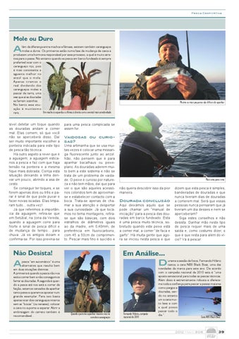 para uma pesca complicada se assim for. Vaidosas ou curiosas? Uma artimanha que se usa muitas vezes é colocar uma missanga fluorescente junto ao anzol. Não, não pensem que é para apanhar bacalhaus ou peixeplano. As douradas aderem muito bem a este sistema e não se trata de um problema de vaidade. O peixe é curioso por natureza e não tem mãos, daí que para ver o que são aqueles acessórios coloridos tem de aproximarse e estabelecer contacto com a boca. Trata-se apenas de chamar a sua atenção e despertar a sua curiosidade. Já que tocámos no tema montagens, refirase que são básicas, com dois estralhos de diâmetros iguais ao da madre, em 0,40mm, de preferência em fluorocarbono, com 45 a 50cm de comprimento. Pescar mais fino é suicídio e