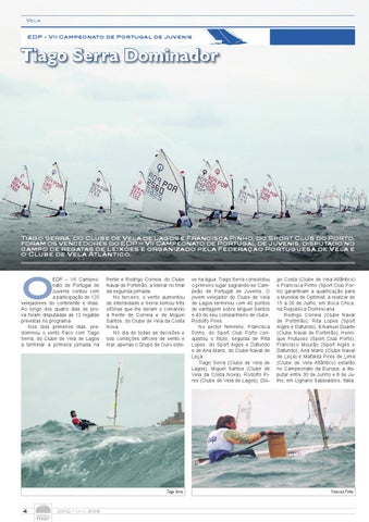 ve na água. Tiago Serra consolidou o primeiro lugar sagrando-se Campeão de Portugal de Juvenis. O jovem velejador do Clube de Vela de Lagos terminou com 40 pontos de vantagem sobre Miguel Santos e 43 do seu companheiro de clube, Rodolfo Pires. No sector feminino, Francisca Pinho, do Sport Club Porto conquistou o título, seguida de Rita Lopes, do Sport Algés e Dafundo e de Ana Mariz, do Clube Naval de Leça. Tiago Serra (Clube de Vela de Lagos), Miguel Santos (Clube de Vela da Costa Nova), Rodolfo Pires (Clube de Vela de Lagos), Dio-
