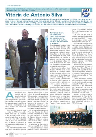 buídas T-Shirts FPAS/ Marietel/ TMN e lanches de mar aos participantes. Em cada um dos dias foi também realizada uma emissão em directo da FPAS TV, durante as pesagens e com acesso através do site: www.fpas.pt. No final realizou-se a entrega dos prémios aos Atletas: o vencedor deste Campeonato Regional de Promoção do Continente foi o António Silva – com uma pontuação percentual de 200%, do Clube Open Ocean/ Marina de Cascais, em segundo o Maurício Fragoso – com 141%, Individual e em terceiro, o Paulo Moreira – com 136%, também Individual. A classificação por clubes ficou ordenada pelo vencedor: o Clube Open Ocean/Marina de Cascais, em segundo o Clube Naval de Peniche e em terceiro, o Grupo Desportivo e Cultural da Administração do Porto de Sines. Deste Campeonato Regional de Promoção de Pesca Submarina do continente vão ser apurados 25 Atletas, que se vão juntar aos 10 que transitaram do Campeonato Nacional de 2011, para em conjunto disputarem o Campeonato Nacional de Elite de 2012, em Sines. A FPAS no final agradeceu a colaboração do Porto de Recreio de Oeiras, da Mega Náutica, da Tornado Boats, da Sacolinha, da Marietel, da TMN e da POPUP Filmes.