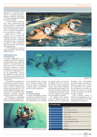 agradecer o excelente acolhimento e condições disponibilizadas no complexo de piscinas do Clube Propaganda de Natação, em Ermesinde. A FPAS também disponibilizou meios audiovisuais que proporcionaram a transmissão em directo para o público presente nas bancadas e efectuaram a cobertura fotográfica e em vídeo de todo o evento. Desta forma, a FPAS, em conjunto com os Clubes participantes procurou reunir as condições técnicas e logísticas necessárias para a realização de mais um evento desportivo nacional na área das actividades subaquáticas. A FPAS agradece a colaboração da Marietel, da TMN e da POPUP Filmes. Referências históricas O Hóquei Subaquático foi inventado em 1954 em Inglaterra por Alain Blake com o intuito de entreter os mergulhadores na altura do inverno. Inicialmente chamado ”Octopush”, o Hóquei Subaquático ao longo dos anos foi sofrendo modificações a nível de equipamento, número de jogadores e outros factores decisivos para transformá-lo na modalidade internacional que é hoje em dia. Actualmente é praticado em quase todos os países da Europa, com destaque para o Reino Unido, França e Holanda que são as maiores potências. A nível Mundial temos países como a África do Sul, Austrália, Nova Zelândia, Colômbia, Estados Unidos da América e Canadá. Em Portugal, a modalidade existe oficialmente desde 2007, tendo ocorrido experiências pré-