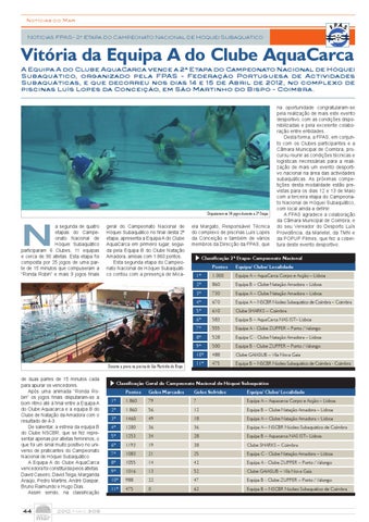 geral do Campeonato Nacional de Hóquei Subaquático no final desta 2ª etapa, apresenta a Equipa A do Clube AquaCarca em primeiro lugar, seguida pela Equipa B do Clube Natação Amadora, ambas com 1.860 pontos. Esta segunda etapa do Campeonato Nacional de Hóquei Subaquático contou com a presença de Mica-