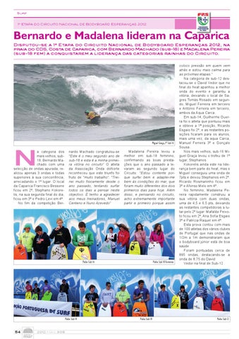 Bernardo e Madalena lideram na Caparica Disputou-se a 1ª Etapa do Circuito Nacional de Bodyboard Esperanças 2012, na praia do CDS, Costa de Caparica, com Bernardo Machado (sub-18) e Madalena Pereira (sub-18 fem) a conquistarem a liderança das categorias rainhas do Circuito.