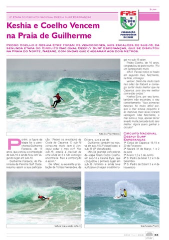 Keshia e Coelho Vencem na Praia de Guilherme Pedro Coelho e Keshia Eyre foram os vencedores, nos escalões de sub-18, da segunda etapa do Circuito Nacional Deeply Surf Esperanças, que se disputou na Praia do Norte, Nazaré, com ondas que chegaram aos dois metros. gar no sub-18 open. Pedro Coelho, de 16 anos, congratulou-se pelo triunfo: “Foi um campeonato muito difícil. Passei todos os heats em segundo mas, felizmente, na final, consegui vencer. Senti-me muito bem nas odas da Nazaré e consegui surfar muito melhor que na Caparica, pois dou-me melhor com estas ondas.” Keshia Eyre, por seu turno, também não escondeu o seu contentamento: “Nas primeiras baterias, foi muito difícil porque o mar estava pequeno e as meninas mais leves tiraram vantagem. Mas felizmente, o mar subiu e, hoje, apesar de ter levado muita pancada tudo saiu melhor. Agora quero ganhar o circuito!”