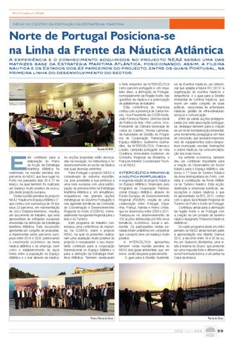 Norte de Portugal Posiciona-se na Linha da Frente da Náutica Atlântica A experiência e o conhecimento adquiridos no projecto NEA2 serão uma das matrizes base da Estratégia Marítima Atlântica, posicionando, assim, a fileira náutica e os Estados dos 23 parceiros do projecto, entre os quais Portugal, na primeira linha do desenvolvimento do sector.
