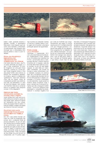 nas 9 pontos do Campeão Carella) e Francesco Cantano obteve o sexto lugar com 42 pontos, uma baixa pontuação apesar da regularidade. Para onde vai a F1H2O? Terminado o Campeonato 2011 com uma bela festa promovida pelos Organizadores locais, pairava no ar a incerteza dos caminhos da F1H2O. Já há muitos anos o Campeonato não tem o número ideal de 24 pilotos em 12 equipas, cada dia fica mais difícil fazer parte do circuito mundial. Se por um lado faltam equipas, do outro falta um Calendário consistente, com provas na Europa a custos sintonizados com a realidade europeia de pobreza total. Até o fechamento dessa edição o Campeonato Mundial UIM de F1H2O tinha apenas 5 cidades confirmadas e 3 a serem confirmados os cancelamentos. Quais seriam os motivos dessa incerteza? Qual o preço cobrado dos Promotores Europeus que não conseguem manter sequer 1 prova da Categoria mais importante e competitiva da Motonáutica? O exemplo negativo fica