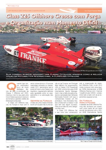 uando Ugur Isik, um empresário turco de muito destaque, deixou de lado a promoção da Classe 1 Offshore em 2003, resolveu criar no seu país uma nova Classe que pouco a pouco se tornaria a grande vedeta da Motonáutica Mundial. A Class 225 Offshore nasceu na Turquia e hoje com 9