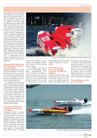 Management (dono da equipa) com objectivo de levar a categoria a outros países dentro e fora da Europa. A parceria já vem trabalhando desde o mês de Setembro 2011 com vistas ao Campaonato Mundial UIM da Class 225 Offshore de 2013 e 2014. Segundo Gustavo Bahia de Almeida, principal Executivo e dono do Grupo GHB International Sports Management, tudo é o resultado da amizade e a experiência de trabalhos de sucesso conjunto com o Grupo Isiklar, desde a Class 1 em Portugal no ano de 2003. Agora somos responsáveis pela promoção de etapas do Campeonato em novos países e já temos 5 cidades em 3 países em avançado estágio de negociação e mais 2 em fase de prospecção. Tudo leva a crer que ainda em 2012 o Campeonato terá as duas provas finais em um novo país no mês de Novembro ou Dezembro. Etapas de abertura em Istambul foram um sucesso As etapas de abertura do Isiklar UIM World Offshore 225 Championship aconteceu em Istambul, nos dias 5 e 6 de Maio com um clima excelente de sol brilhante, o que facilitou a presença de um grande público. A categoria optou pelo melhor formato para as competições, pois aproveita o sábado e o domingo para realizar provas, maximizando o aproveitamento da infra-estrutura montada e dando ao Campeonato um maior número de provas. Só em 2012 são 14 etapas confirmadas e poderão ainda se somar mais duas o que faz com que a disputa pelo título tenham muitas oportunidades. Equipe de fábrica começa com duas vitórias A equipa ECI Men Cosmetics (88) com os pilotos Kerem Tuncer/Alpay Akdilek, com o barco oficial da fábrica Yuka foram os grandes vencedores das duas etapas e lideram o Campeonato com 440 pontos. Pelo regulamento do Campeonato quem marca pontos são os barcos das equipas, independentes dos pilotos. Assim a equipa