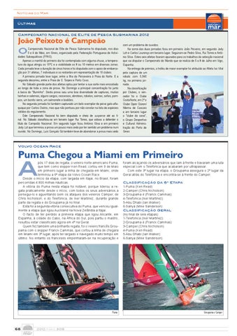 pós 17 dias de regata, o veleiro norte-americano Puma, que tem como skipper Ken Read, cortou em 9 de Maio em primeiro lugar a linha de chegada em Miami, onde terminou a 6ª etapa da Volvo Ocean Race. Desde o início da etapa, com largada em Itajai, no Brasil, foram percorridas 4.800 milhas náuticas. A vitória do Puma nesta etapa foi notável, porque liderou a regata praticamente desde o início, com todos os seus adversários a persegui-lo e aguentando bem os ataques dos veleiros Camper, de Chris Nicholson, e do Telefónica, de Iker Martinez, durante grande parte da regata e do Groupama já no final. Esta foi a segunda vitória consecutiva do Puma, que venceu igualmente a etapa que ligou Auckland na Nova Zelândia a Itajai. O facto de ter perdido a primeira etapa que ligou Alicante, em Espanha, à cidade do Cabo, na África do Sul, pois partiu o mastro, resultou estar classificado agora em 4º na Geral. Quem fez também uma brilhante regata, foi o Veleiro francês Groupama com o skipper Franck Cammas, que cortou a linha de chegara em Miami em 3º lugar, após ter largado e navegado muito tempo em último. No entanto os franceses empenharam-se na recuperação e